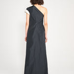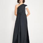 One shoulder caftan dress, gathered at the waist, including a back draped pleat. A small shell draped shoulder sleeve completes this look. Closure: Side exposed zip. 100% Polyester