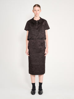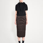 Knee length pencil skirt with raw edging and a slight noir petticoat reveal. Ever so lightly gathered at the waist with an elastic face, including a back slit.