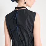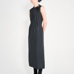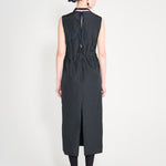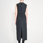 Sleeveless ankle dress with exposed back and raw edging throughout. Two ribbon ties decorate the exposed back, two side pockets and a slightly gathered waist with faced elastic within. Double stitched front seam and a delicate marine edging decorates the neck and shoulders as the final touch to this beauty.