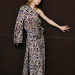 One shouldered dress with deconstructed sleeve with sash belt and slits on either side.