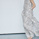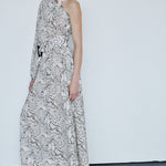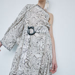 One shoulder dress with draped pleat detail at the shoulder & cuff with buckled sash belt in Kaimak marble print. Side openings on either side.