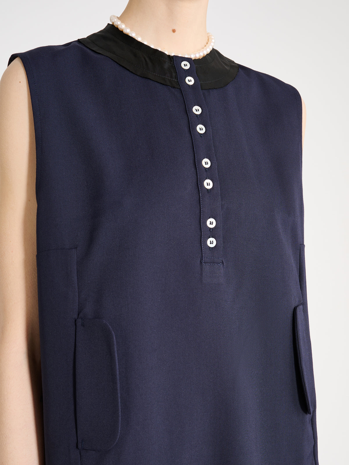 60s inspired petite two pocket dress. Two layer draped pleat skirt detail on front and back.