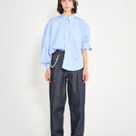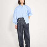 80s style oversized shirt. A drop off the shoulders, the sleeves taper towards the wrist. Front pocket and embroidered 'N' hallmark.