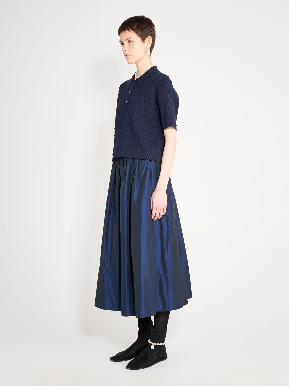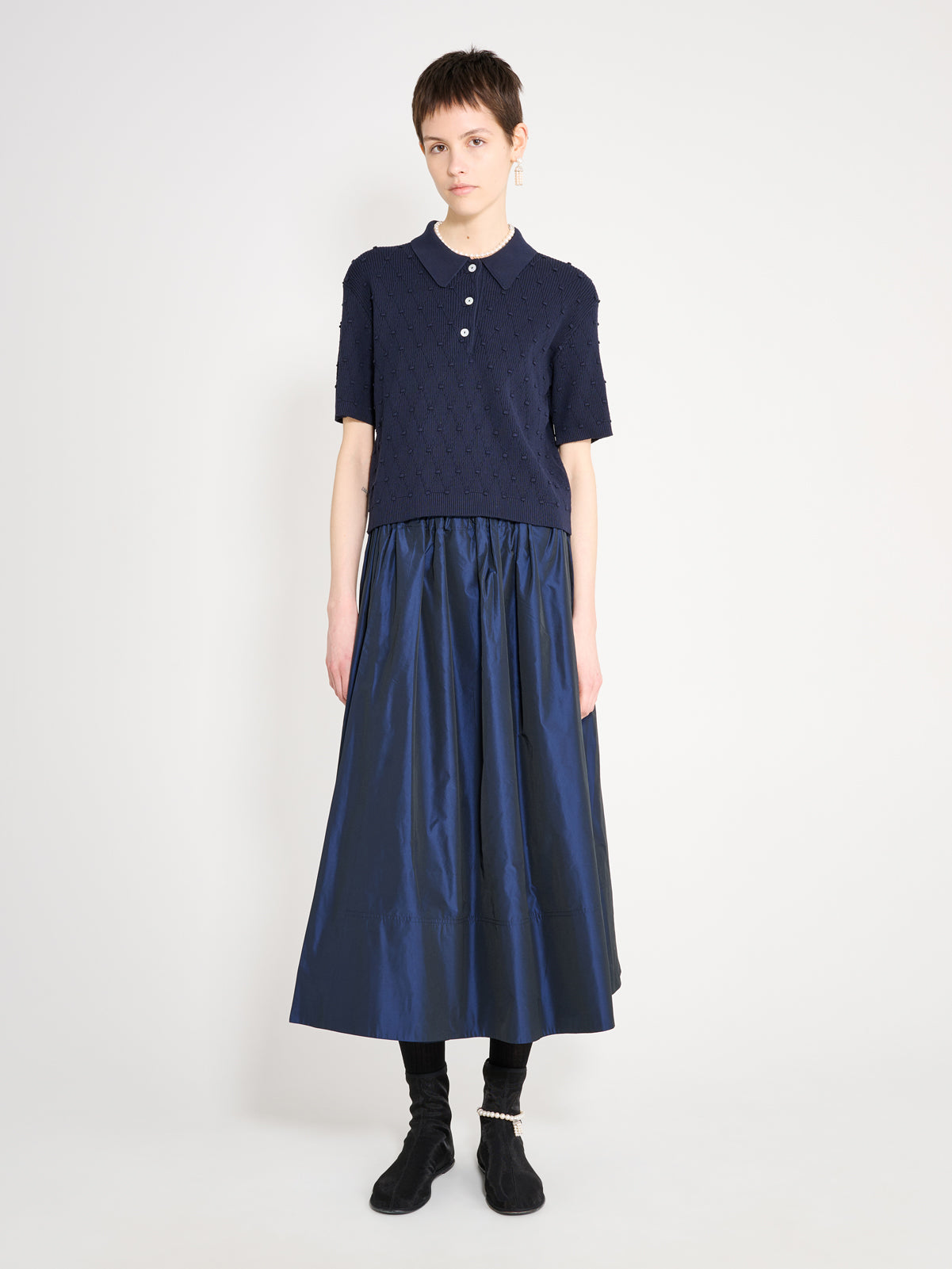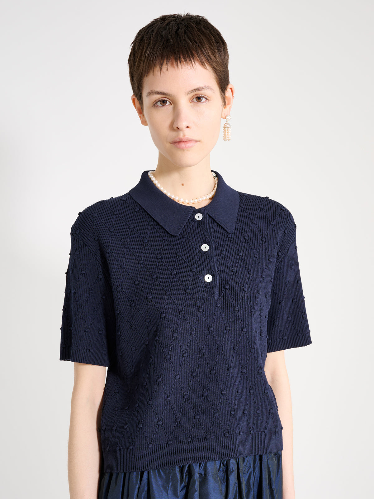 Structured short sleeved, collared knit with baubles and diamond stitching.