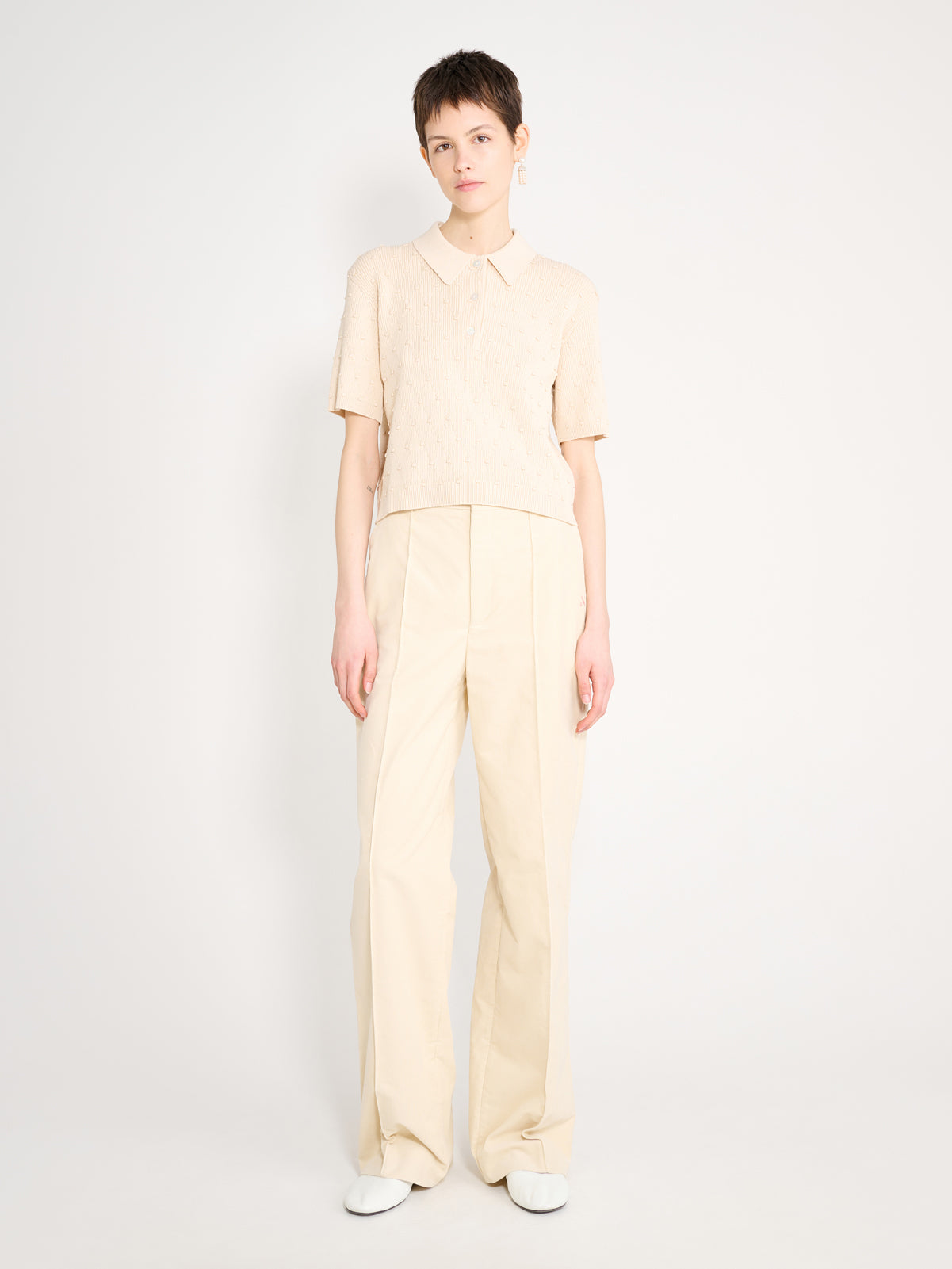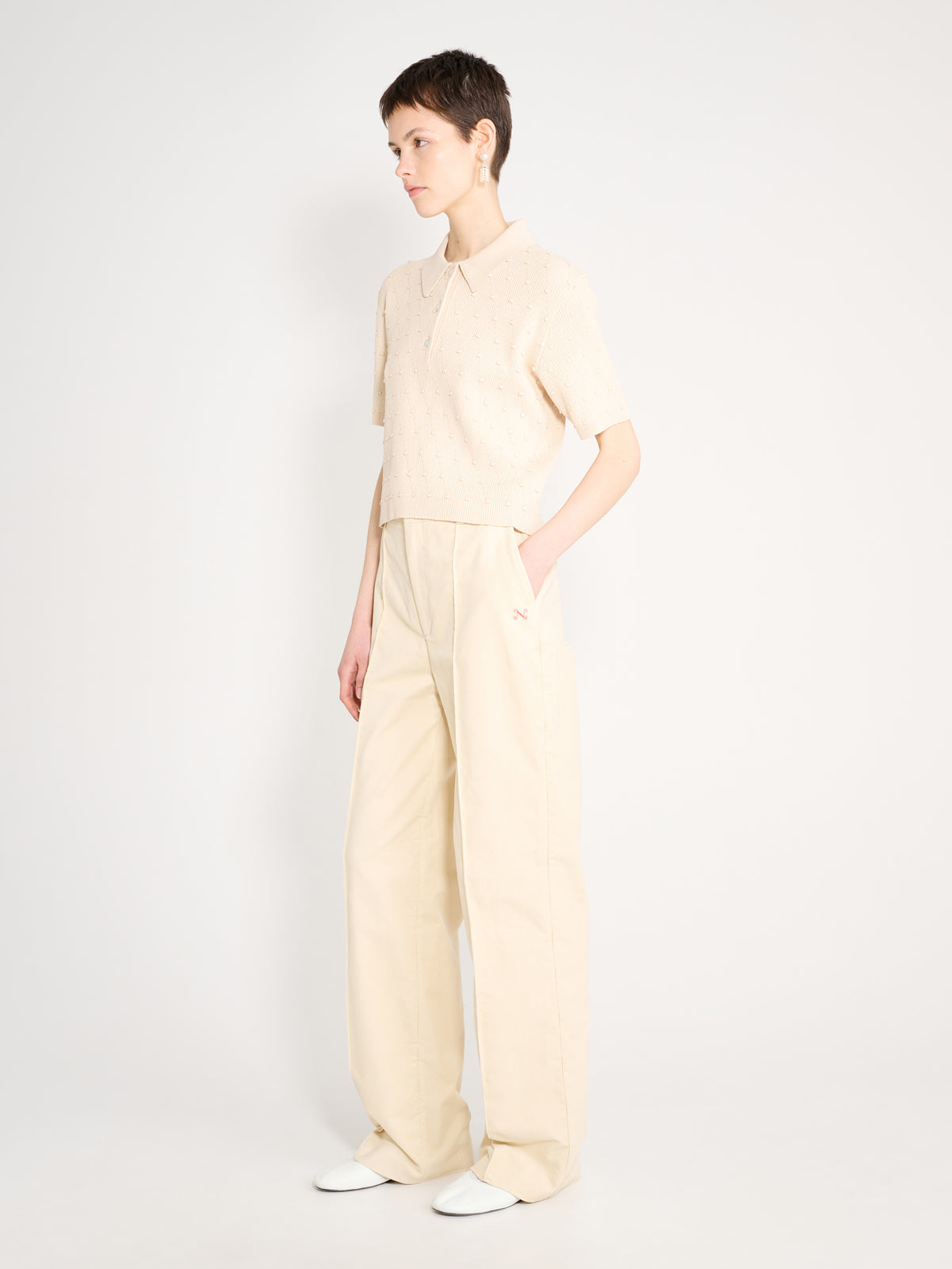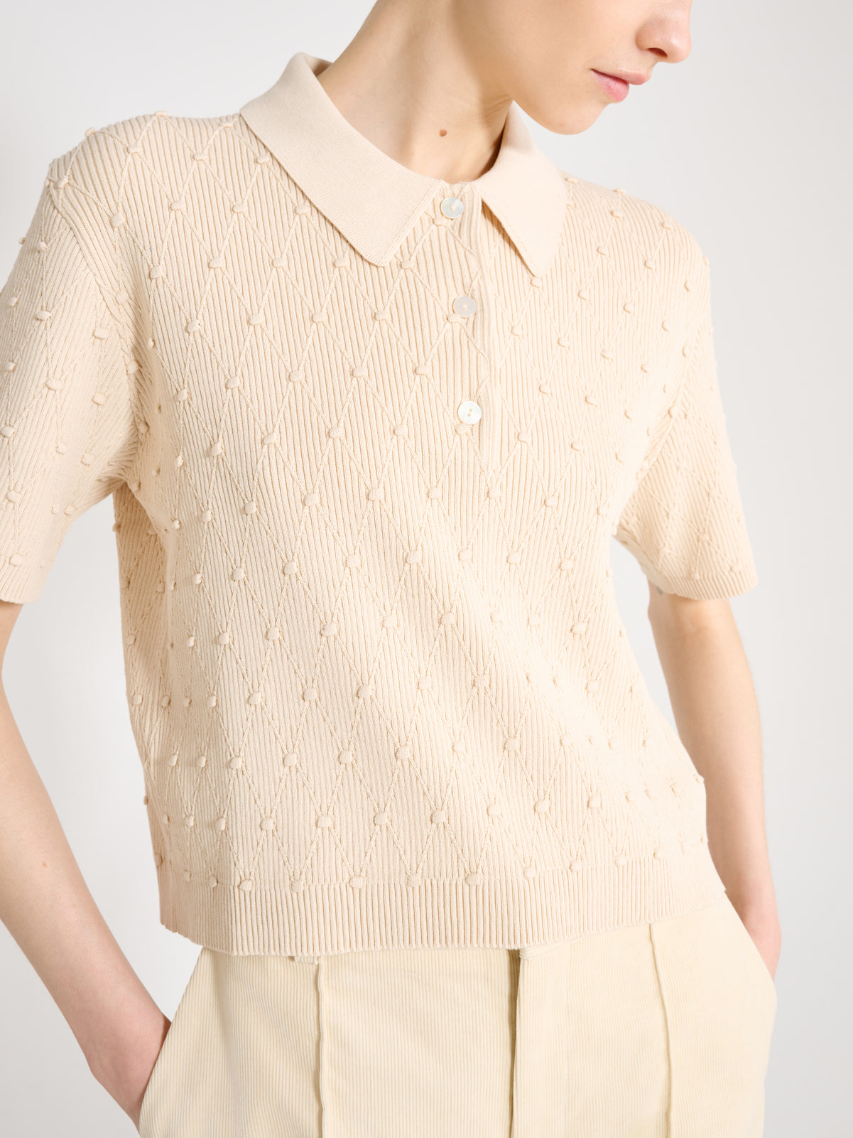Structured short sleeved, collared knit with baubles and diamond stitching.
