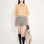 Crop shirt with pointy collar and faux front pockets. Raw edging throughout. Hallmark 'N' embroidery.
