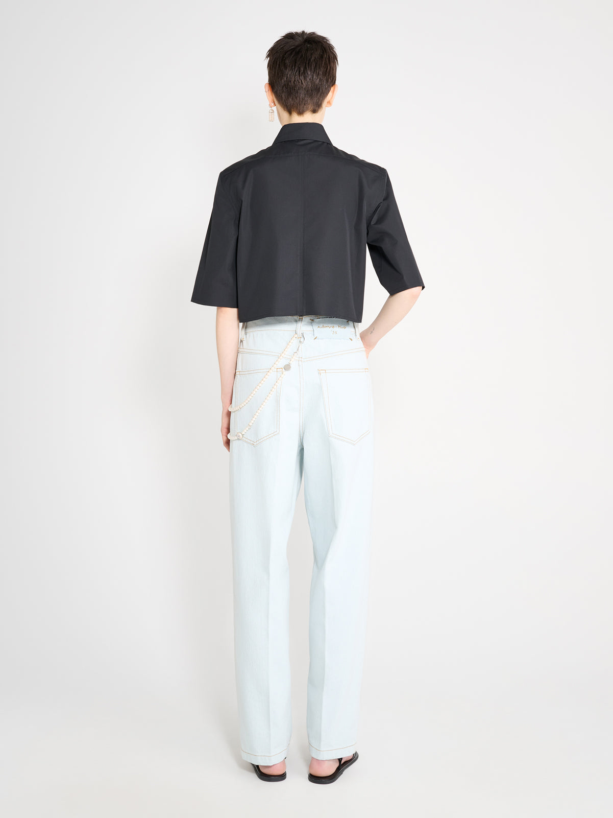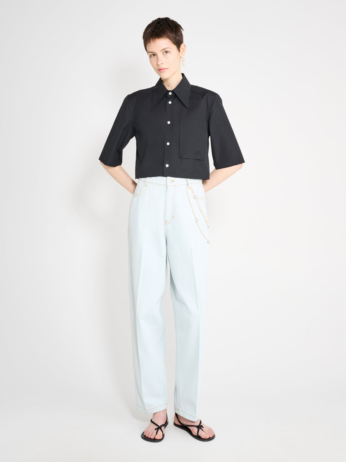 Crop shirt with pointy collar and faux front pockets. Raw edging throughout. Hallmark 'N' embroidery.