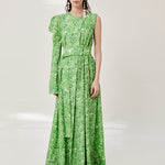 One shoulder dress with deconstructed sleeve and buttoned sash belt. Fastened with back buttons from neck downwards.