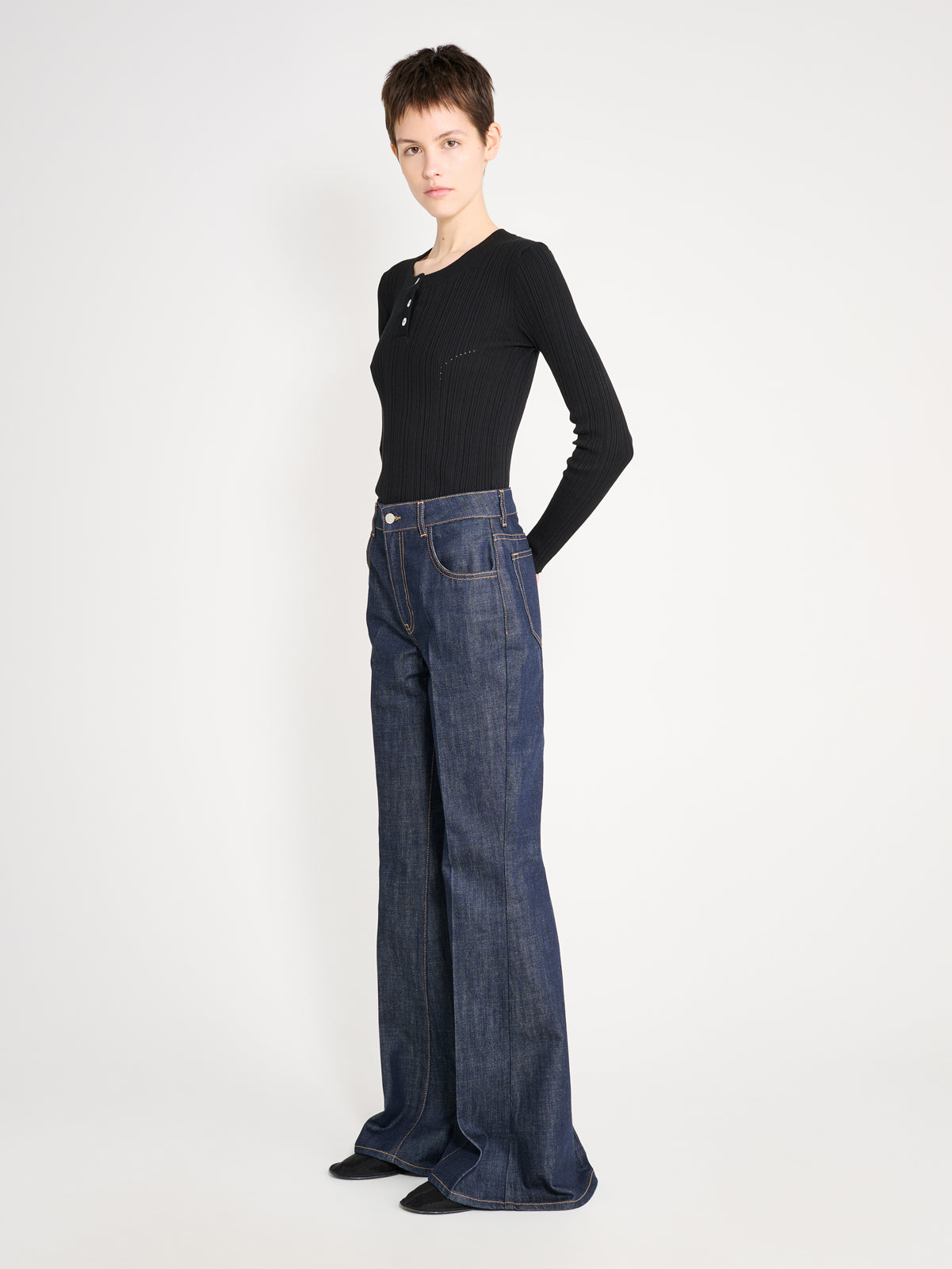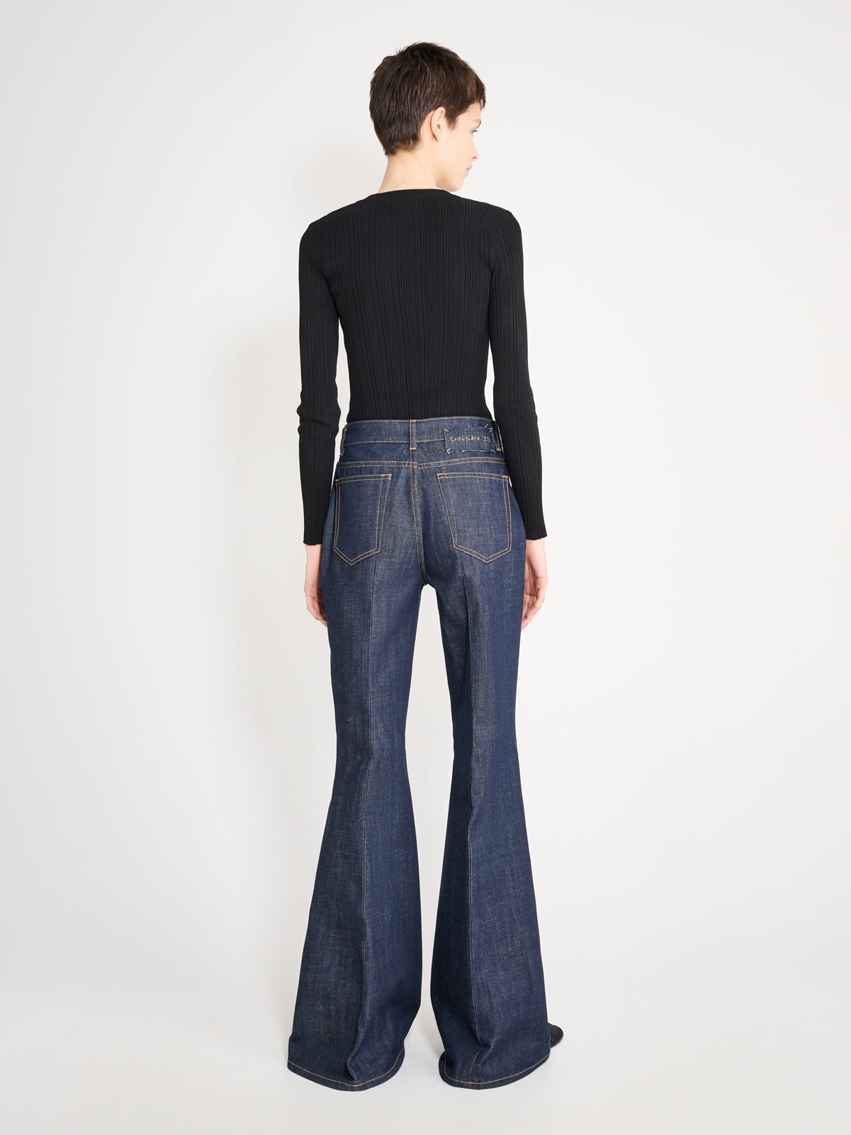 High waist flared jeans with two back and front pockets, including a little change pocket. A raw denim finish with classic stitching.