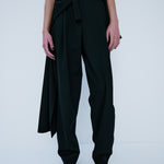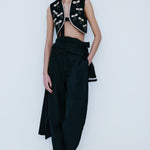 Three front pleated peg style pants with two back faux pockets sans flap and pearl rosary. An easy fitting pant.