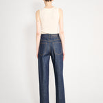 Peg style boy jeans which sit mid waist. Two back pockets and two front pockets. Contrast topstitch detail. Embroidered Automne-Hiver '25 patch sits in the exterior waist band.
