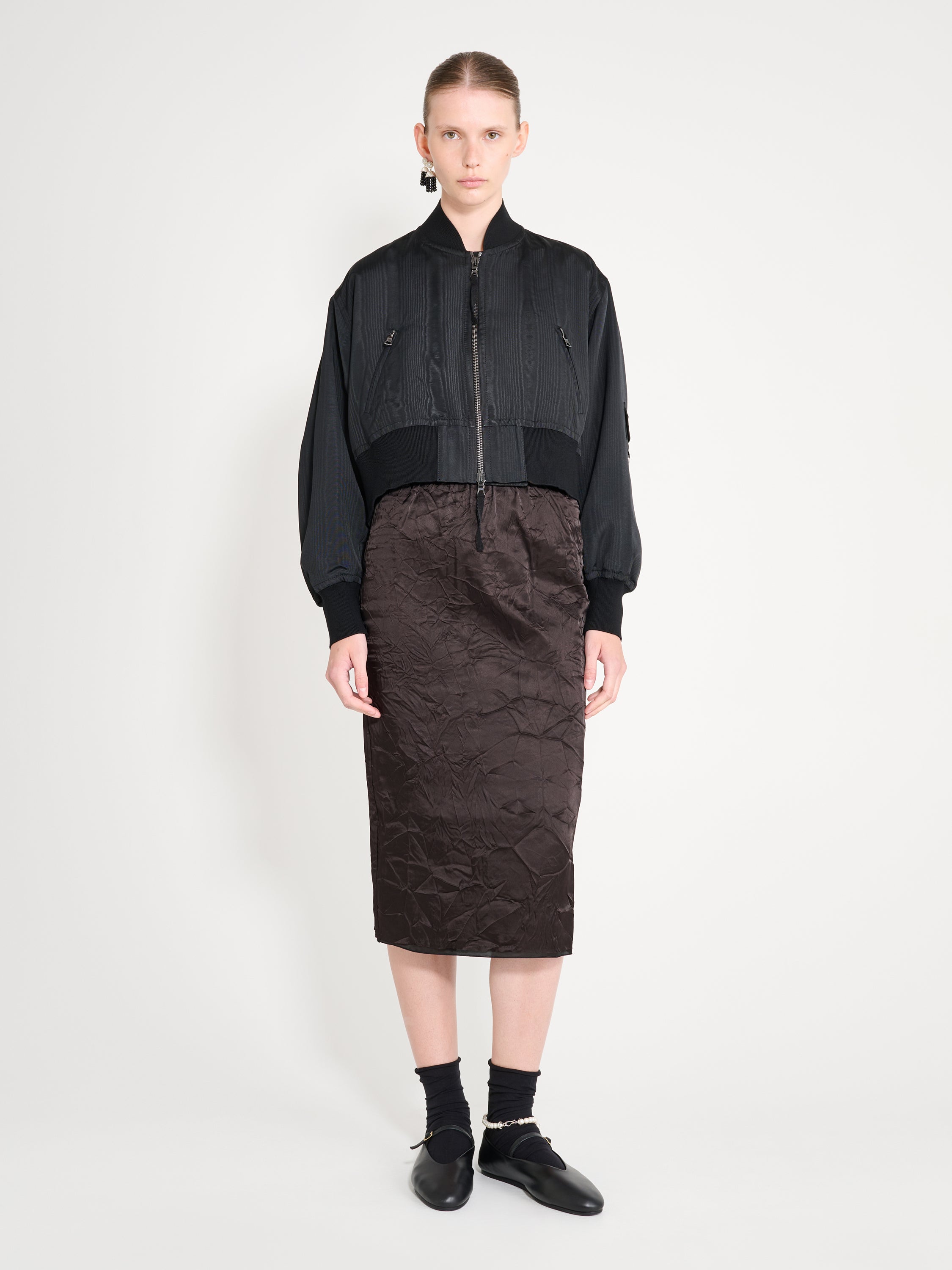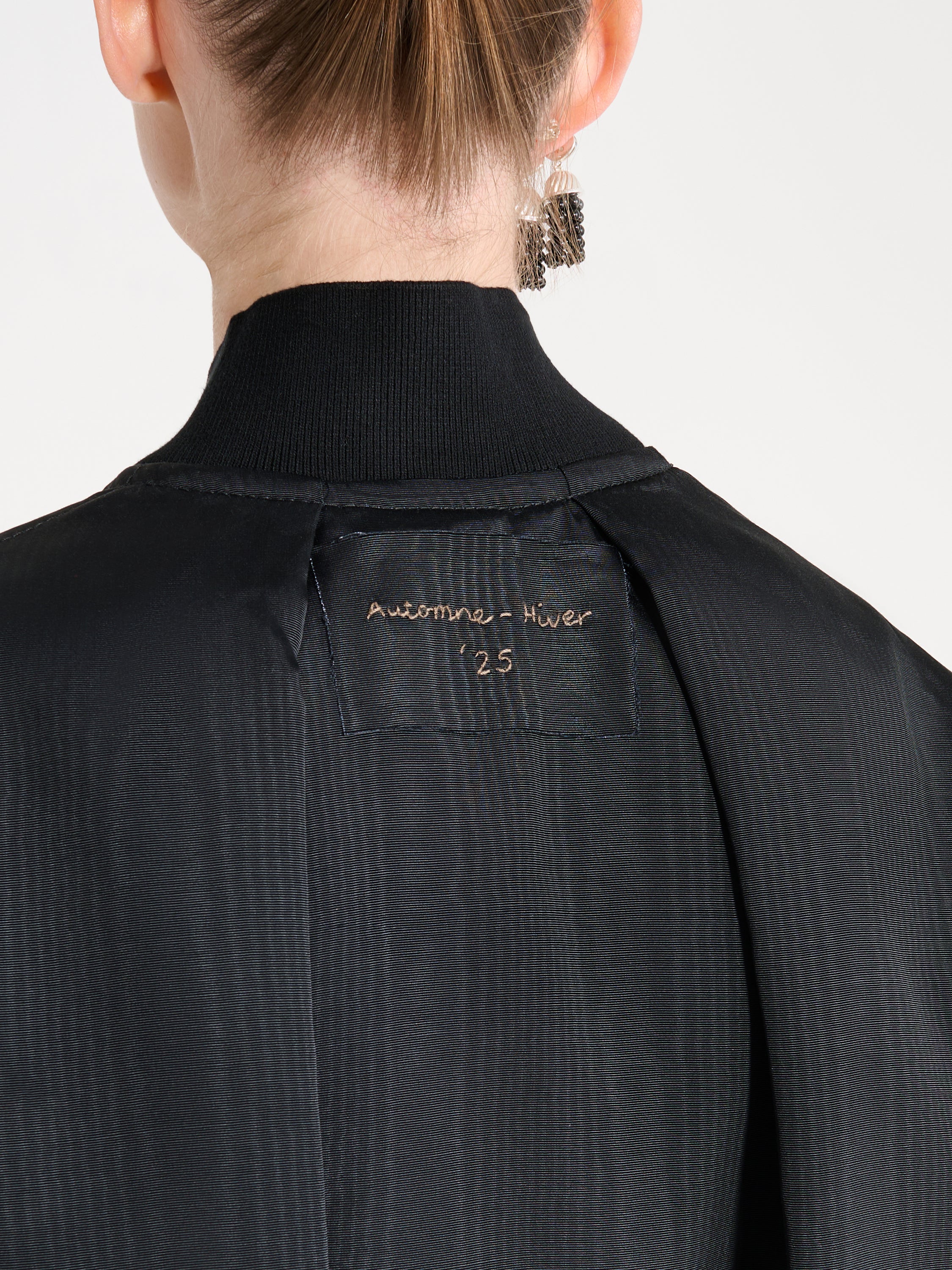 Aviator jacket with wool ribbed cuffs and bottom hem. Two pockets adorn the front whilst two back pleats extend down from the ribbed collar. The Aviator is perfect to be worn over knits in the crisper months. Embroidered 'N' hallmark.
