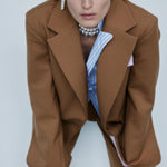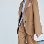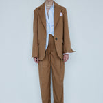 Single-breasted one buttoned jacket with embroidered handkerchief and contrast striped baby pink lining. Cuffs have side opening without buttons. Centre back seam whilst the under sleeves have been tailored with overlapping seam.