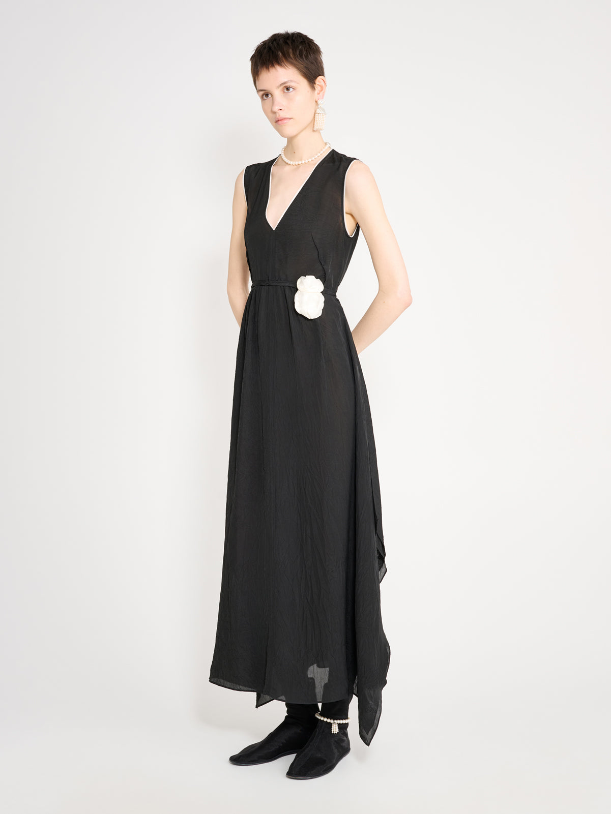 The Cyclamen Dress has a romantic A-line silhouette. The belt as an attached mini pouch in white.