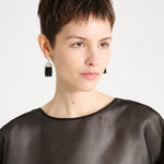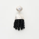 Drop earring with hand-strung onyx, silver hardware and cascading tassels.
