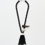 Hand-strung onyx drops with silver hardware and mini onyx pearl tassels.