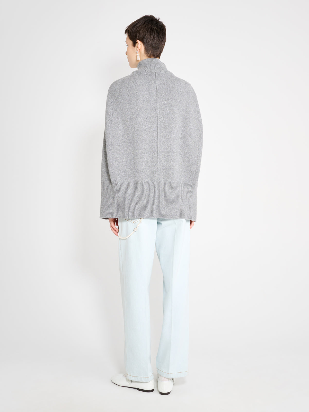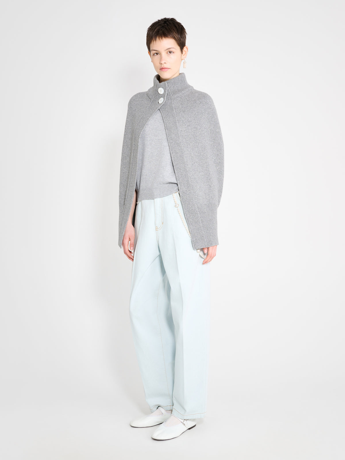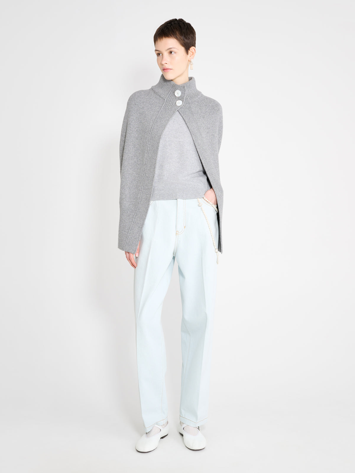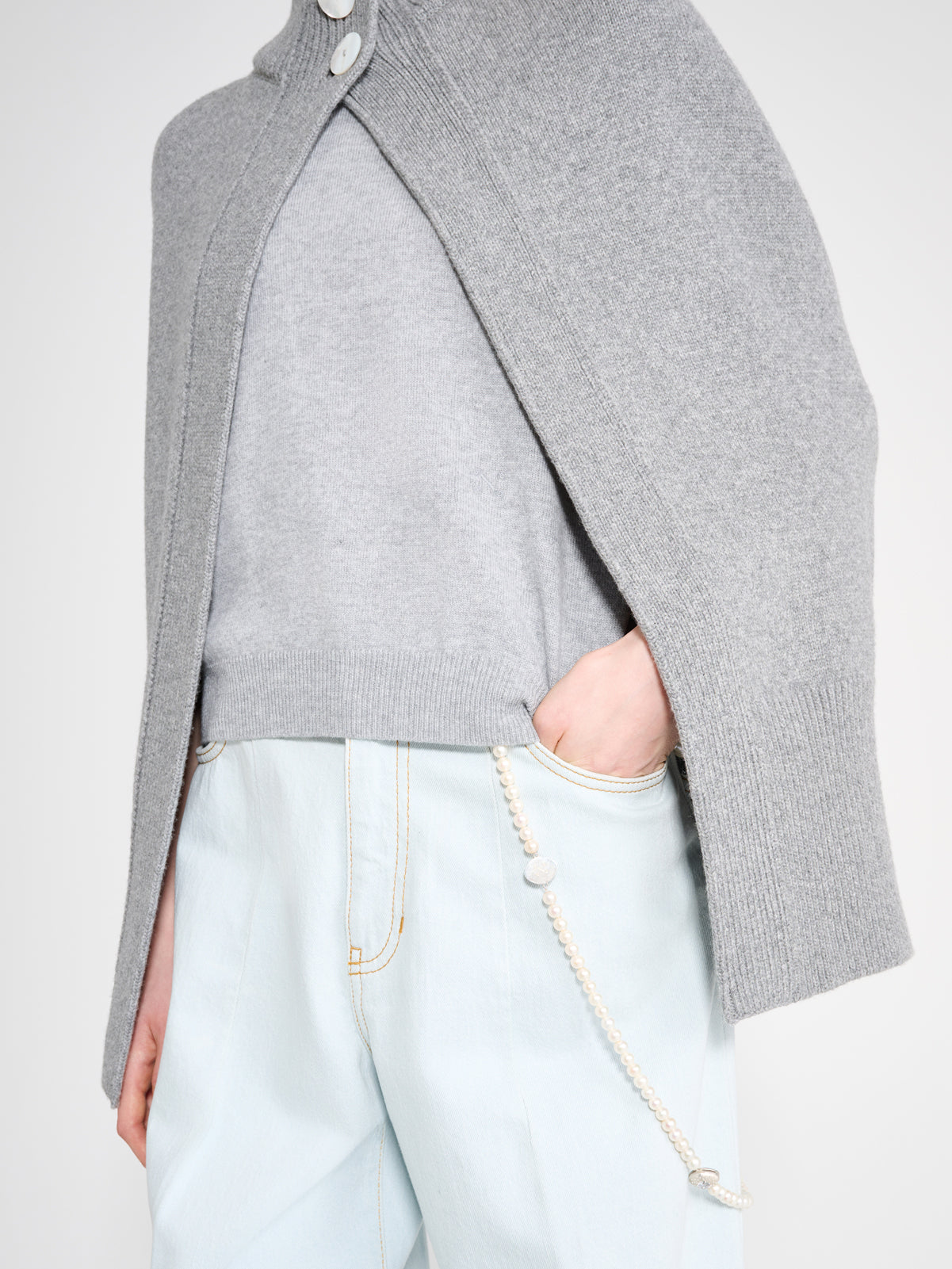 High neck cape with two matching buttons.