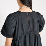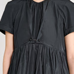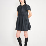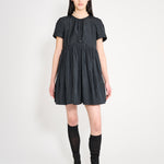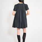 Baby doll dress with detachable embroidered floral collar. Tuck pleats from the waist gives a voluminous edge to this beautiful dress. Our classic mini double pearl pin features in this piece.