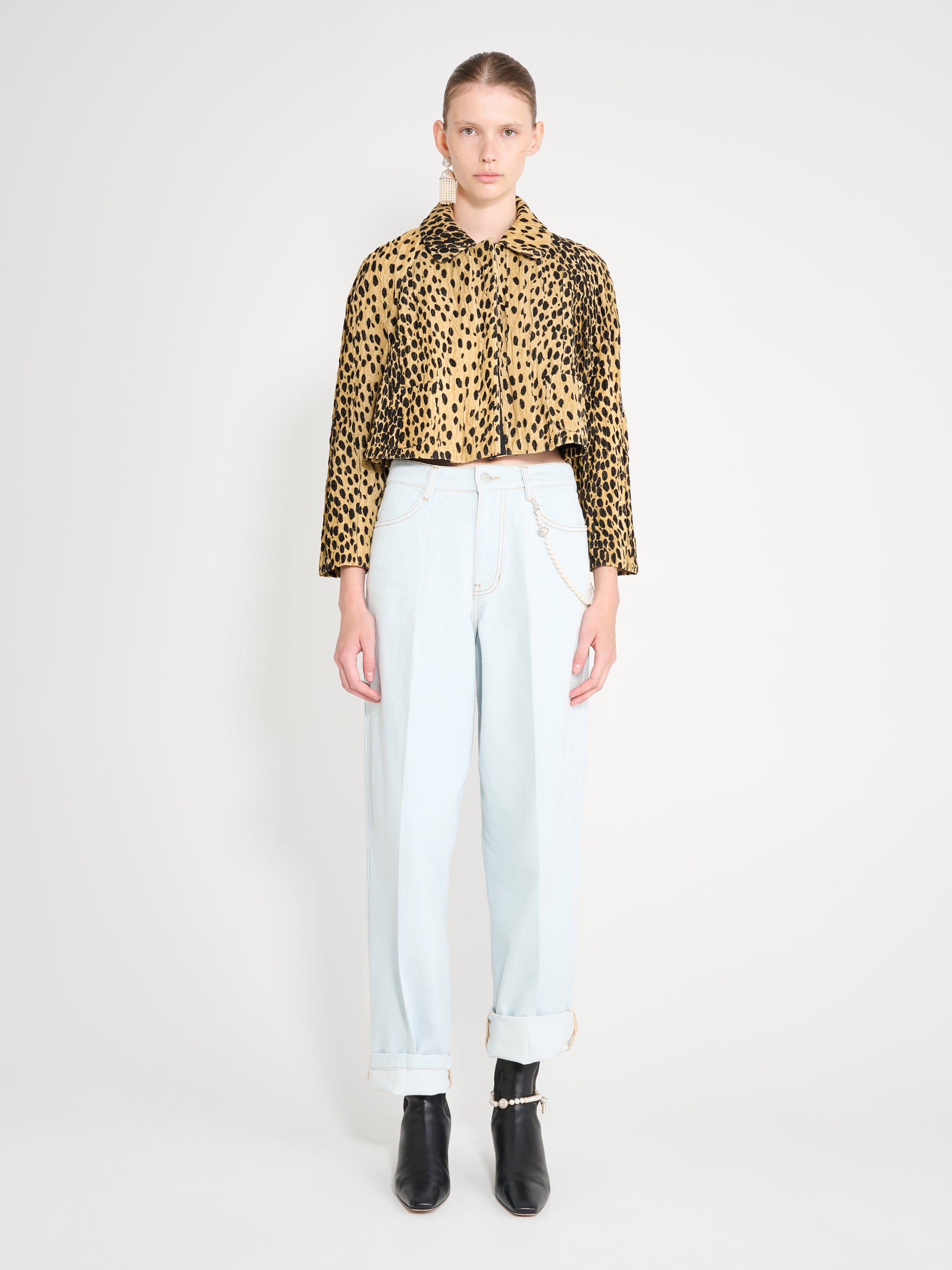 Our Little Jacket in leopard is the perfect in-between weather piece. The shoulder seam cuts across from the neck to under the arm, providing for an easy and comfortable fit, and yet provides a formal element for a polished look. A cropped silhouette & sleeves with two front pockets and elbow patches completes what will become your new favourite garment. Embroidered Automne-Hiver '25 patch sits on the exterior.
