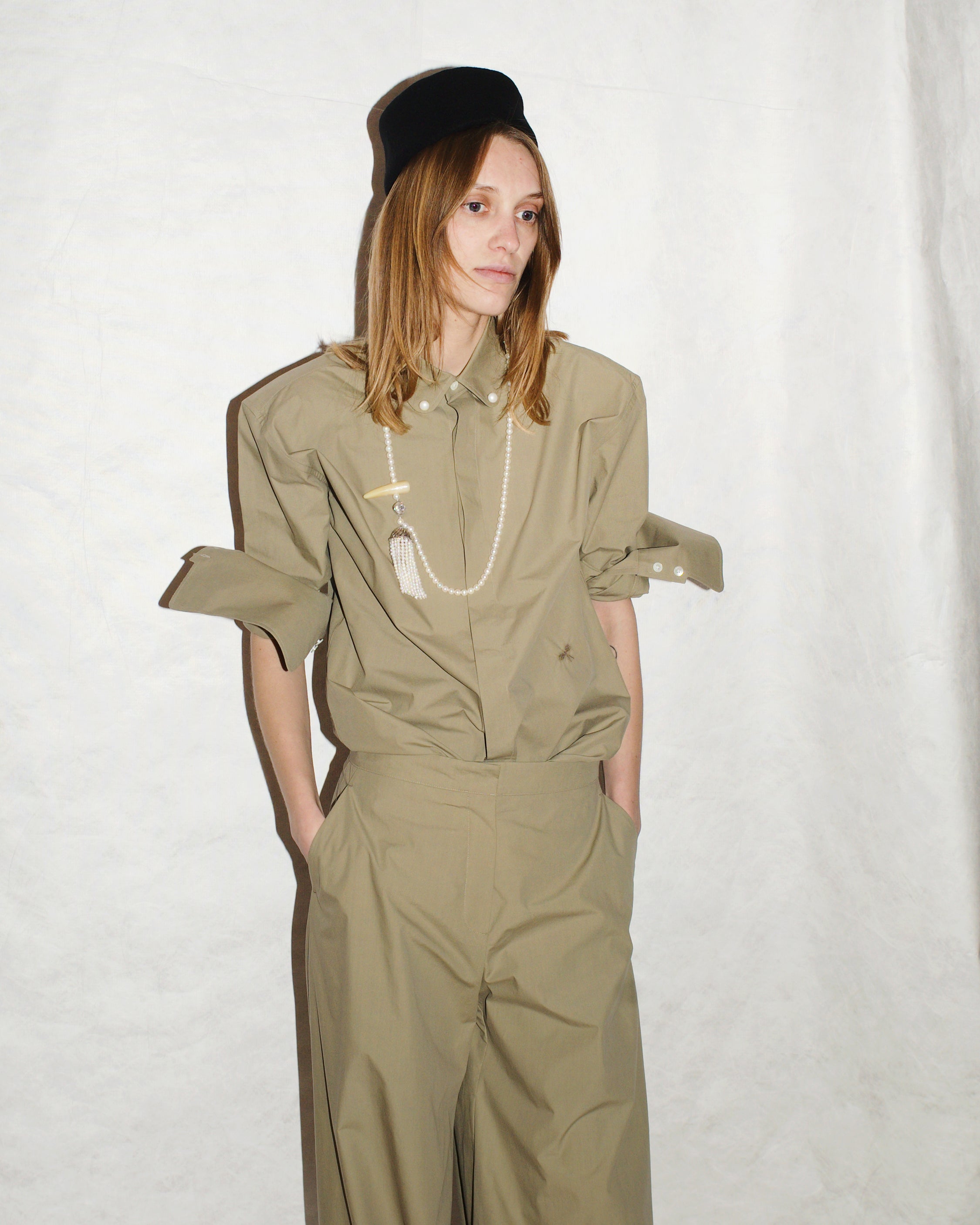 Tailored shirt with detachable shoulder pads, rounded mini collar, pearl details, french cuff. 100% Cotton