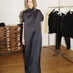 Silk noir cloqué mandarin style dress with three pearl button detail at the back of the neck and one pearl detail on each cuff. Beautiful rose silk lining on the inside. 50% Acetate 50% Viscose
