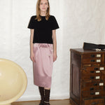 Reversible silk noir cloqué & rose pencil skirt with elasticated waist and single pearl button detail on exterior. 50% Acetate 50% Viscose