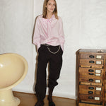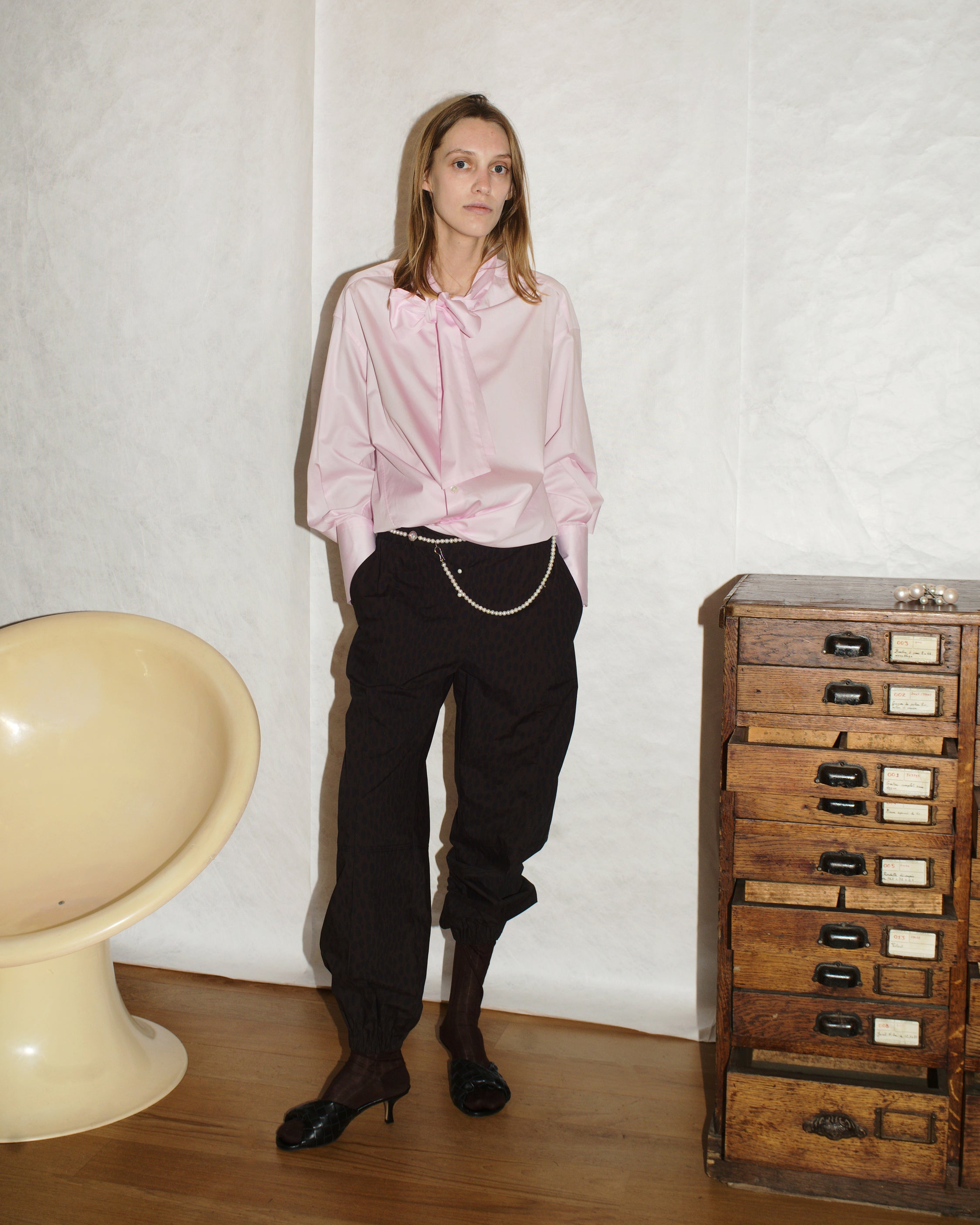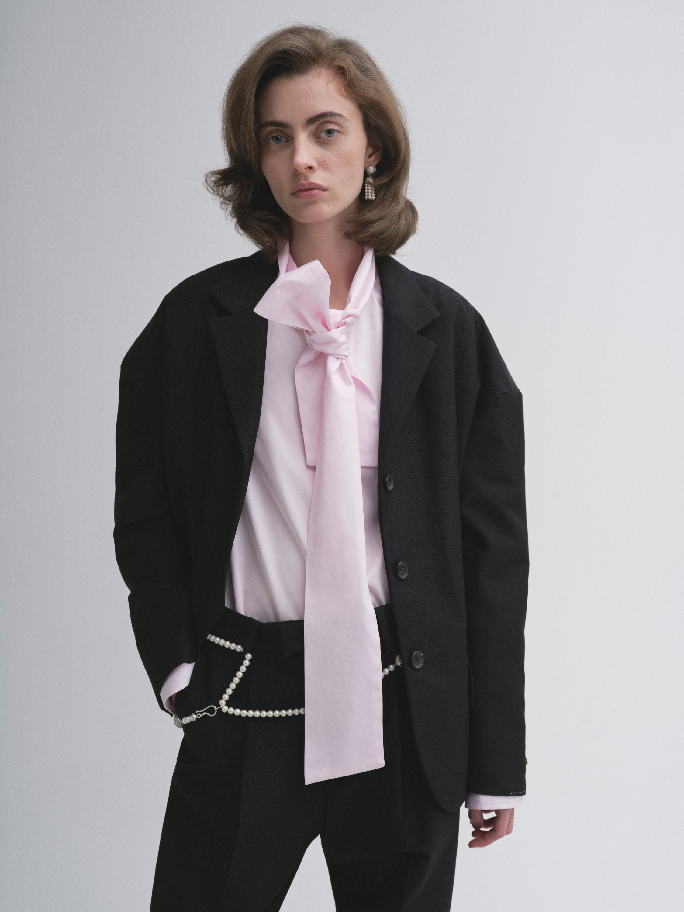 Pink foulard tailored oversized shirt with single pearl detail and embroidered mini bow. The neck scarf can be styled to one's preference. 100% Cotton