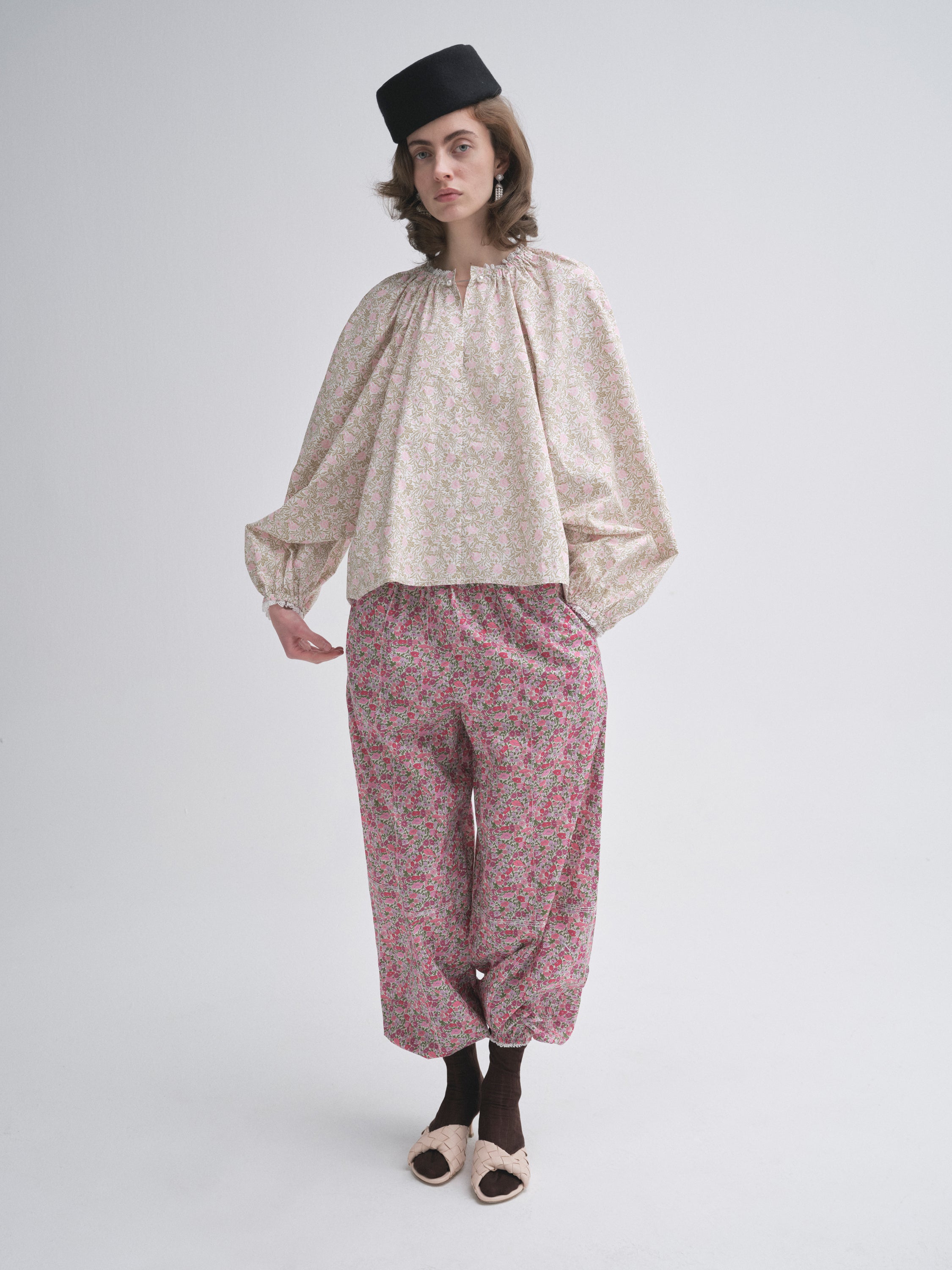 Our signature harem style pants in bright flower fabric. Pin tucks on front and exterior highlighted by light contrast stitching. Two side pockets, elasticated waist and cuffs with lace detail. 100% Cotton