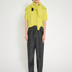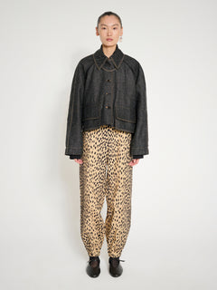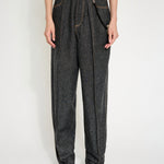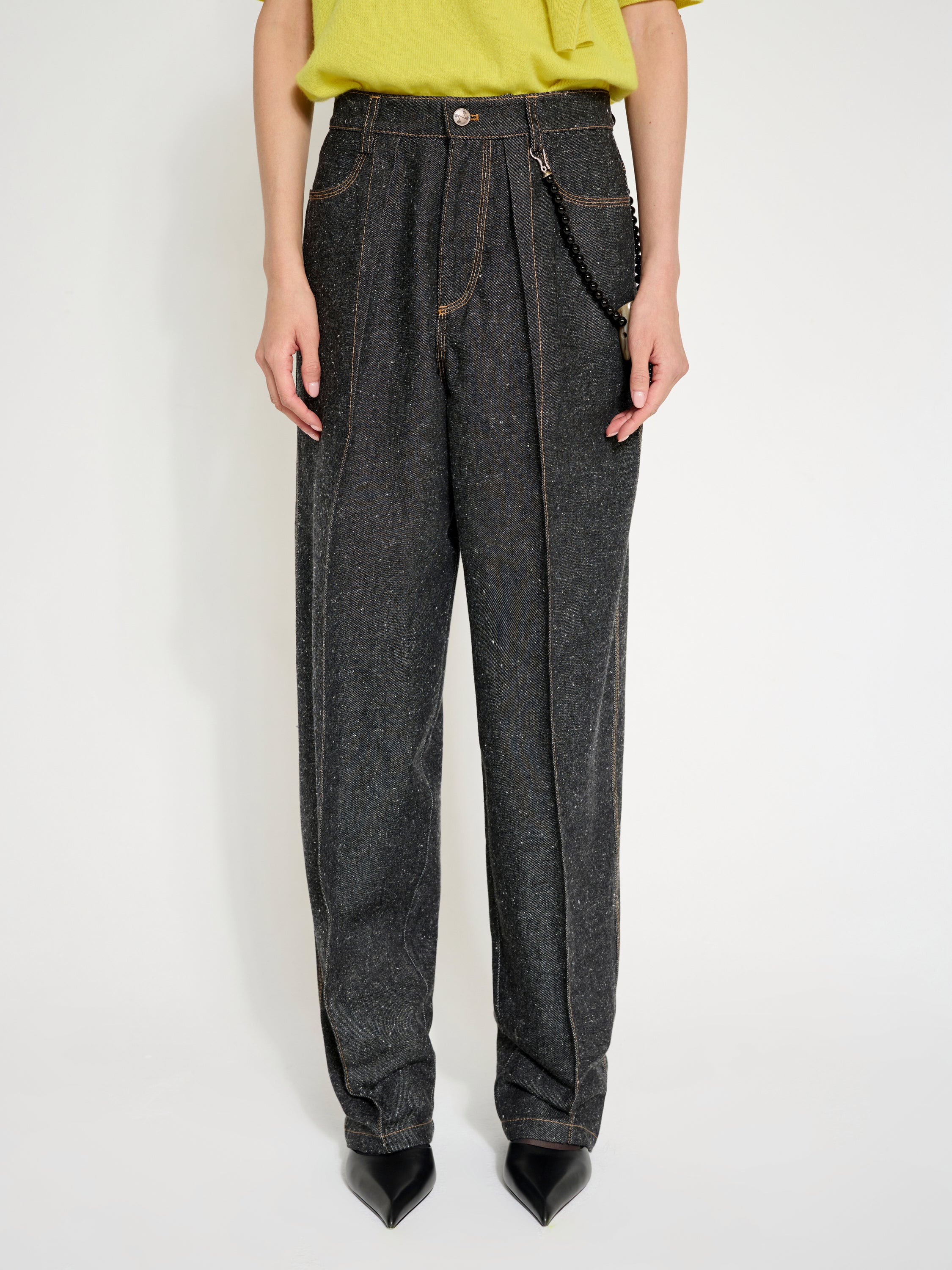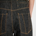 Nackiyé's signature Borrowed Jeans, developed in collaboration with expert Japanese denim artisans, is made from an unprocessed drill denim consisting of a one of a kind virgin wool and silk. A particularly supple fabric for denim, Borrowed has a peg style which sits mid waist. Two back pockets and two front pockets. Features logo-engraved metal buttons. This piece will age with a beautiful patina, thanks to its excellent fabric quality. The denim has not been washed or treated.