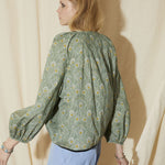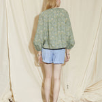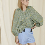 Balloon sleeve gather v-neck top with pearl pin