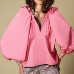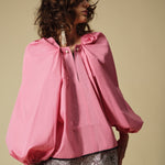 Balloon sleeve gather v-neck top with pearl pin