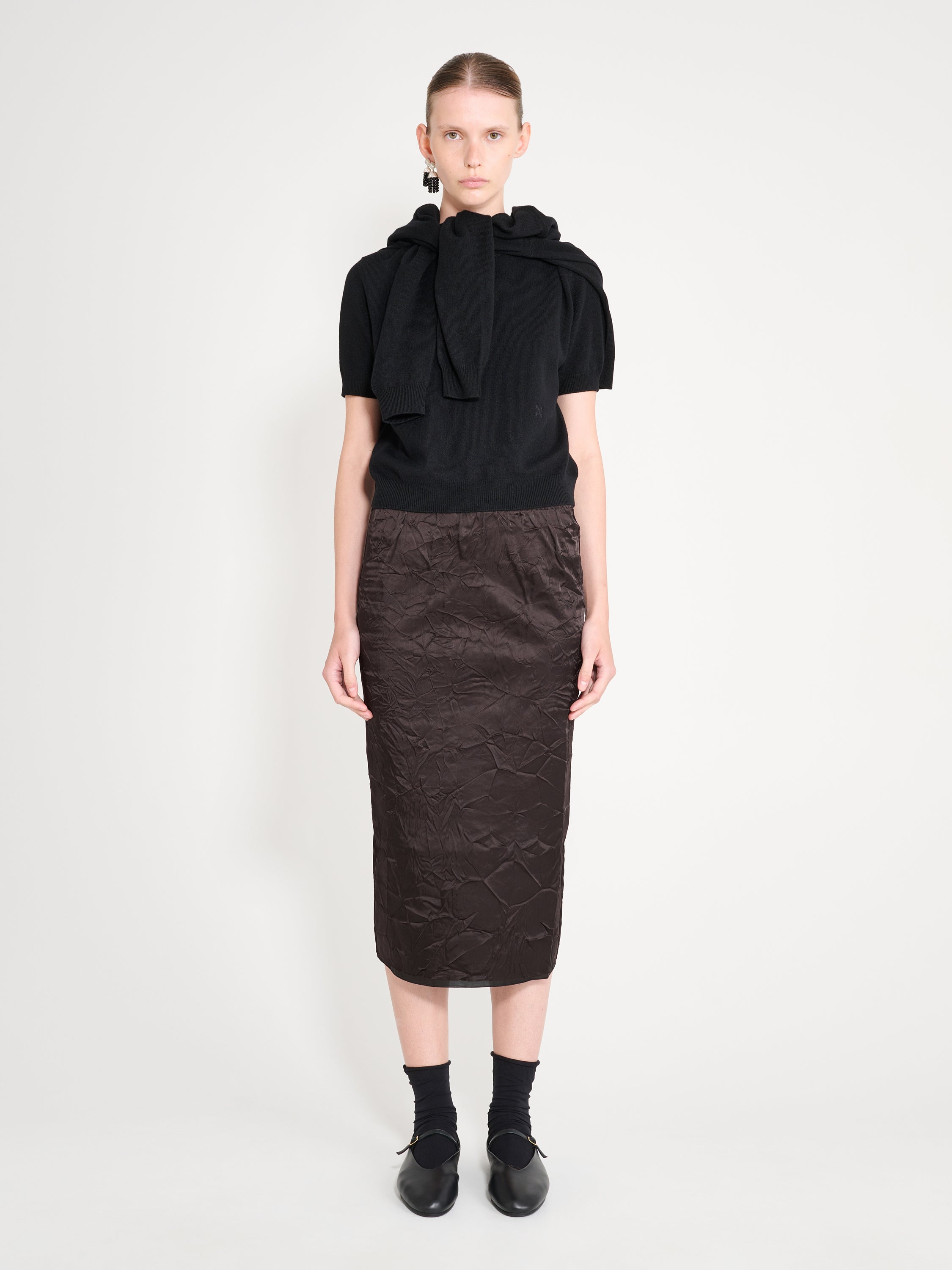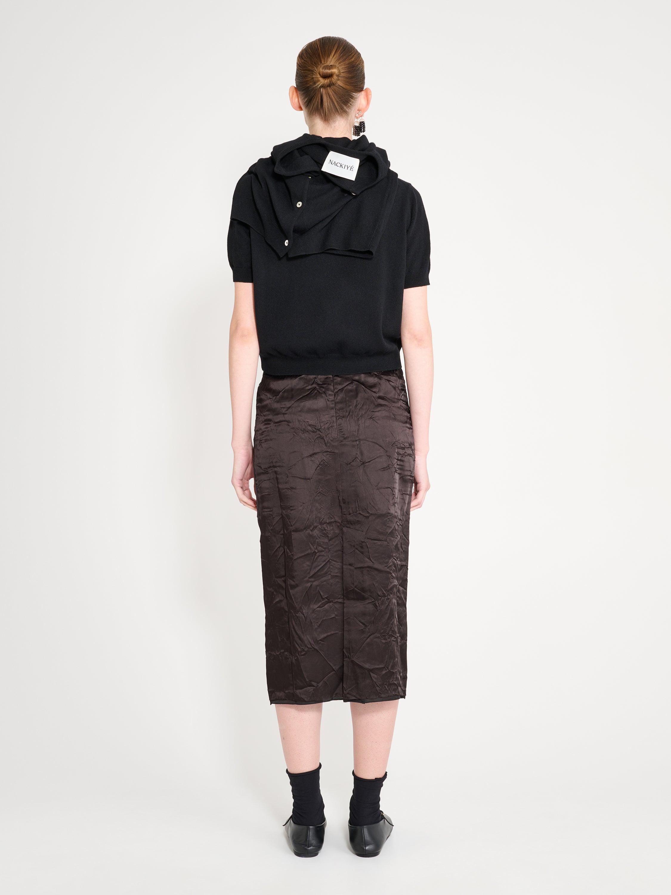 Knee length pencil skirt with raw edging and a slight noir petticoat reveal. Ever so lightly gathered at the waist with an elastic face, including a back slit.