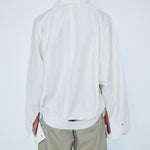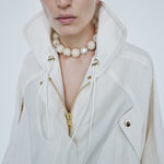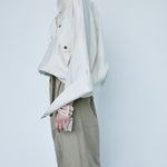 Oversize zip-up windbreaker (anorak style) outwear jacket with single button clasps at the neck and bottom front with a drawstring with clasps to tighten at the neck. Two waist pockets adorn either side. with lace and cut-out. The right-hand bottom edge is embroidered with sage coloured needle lace along the edge. The inside has been meticulously finished with hemmed piping.