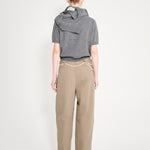 Slightly tapered pants with two wide front pleats extending to the waistband and double belt loops. Two side pockets and two faux exterior pockets.