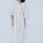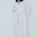 Kimono style, oversized dress with one pearl letter pocket. Ruched pleats with open seam at the waist whilst the bodice has a V-neck cross. Two small side pockets and off the shoulder sleeves adorn our Kimono dress.