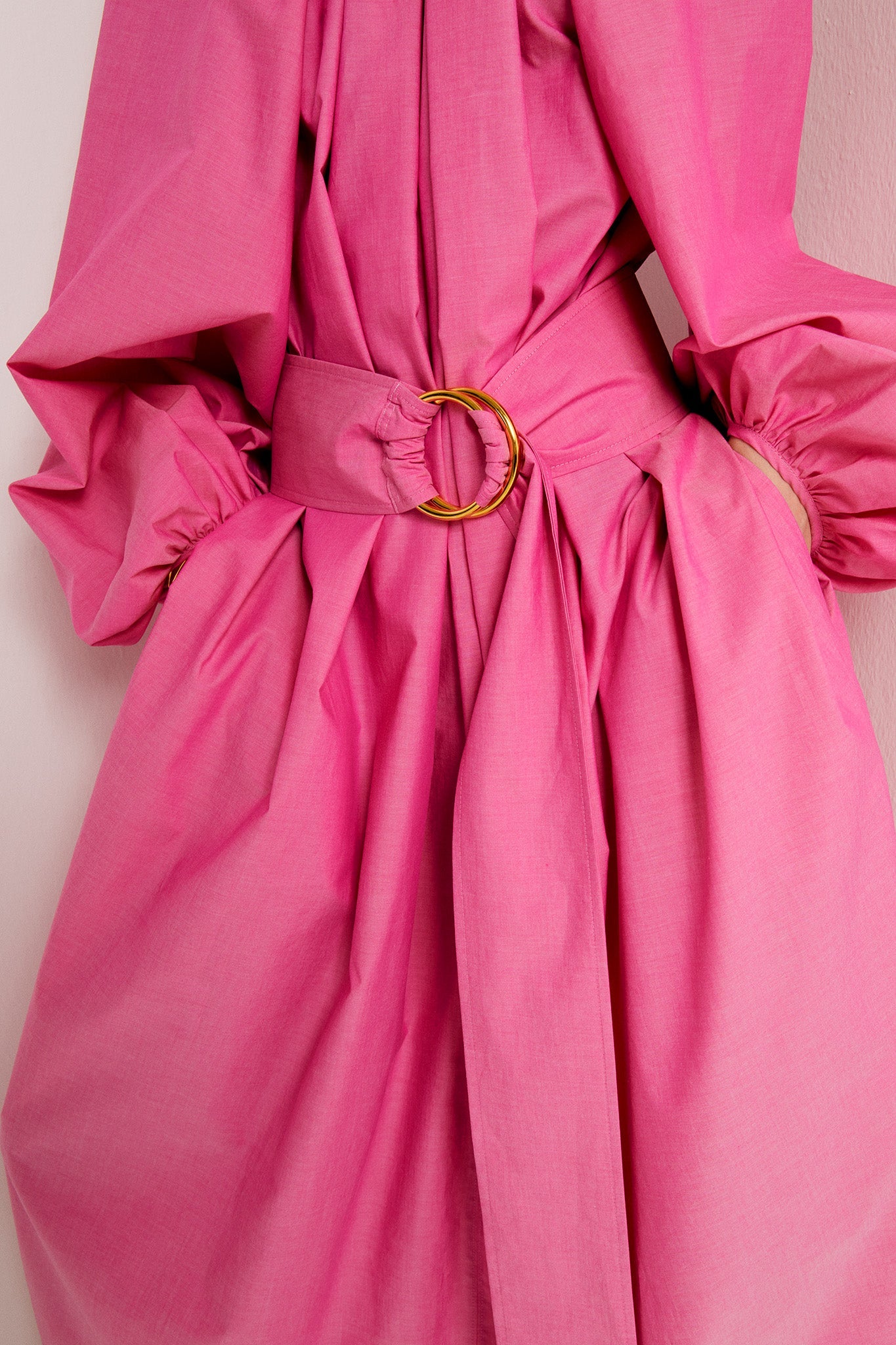 Balloon sleeve dress with pearl pin and buckled sash-belt