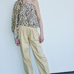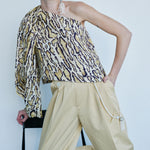 One shoulder, long sleeve top in cat print with draping detail. A pleat extends from the cuff hem giving an added volume to the sleeve.