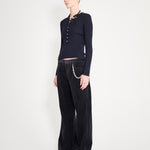 A relaxed low waist straight pant & cropped leg. Inner hemmed piping and belt loops. Two pockets at the rear, including two front pockets. Our hallmark Embroidered 'N' features on the front change pocket.