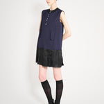 60s inspired petite two pocket dress. Two layer draped pleat skirt detail on front and back.