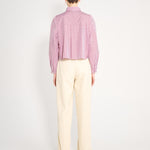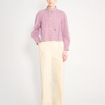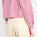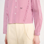 Buttoned up tailored shirt with front and back ruffles running down along the sides from the armhole.