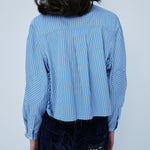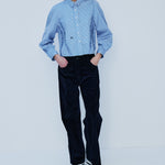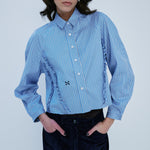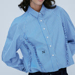 Buttoned up tailored shirt with front and back ruffles running down along the sides from the armhole with frayed bottom hem. Two button cuffs & elbow patches are additional details of the Moshi Moshi.