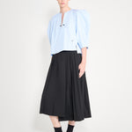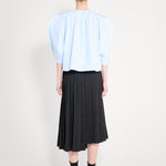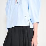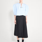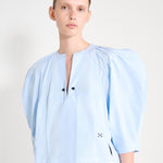 A voluminous shirt with tucks and exaggerated sleeves extending from the neck. Tapered cuffs along with an open neck and our classic mini double pin. Embroidered 'N' hallmark. Finely exposed inner raw edging at the neck and cuffs.