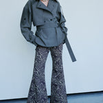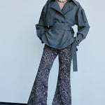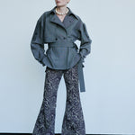 A light trench style tailored, grey fog shirt with belt. Single buttoned breast with an added clasp hook at the neck.
