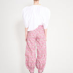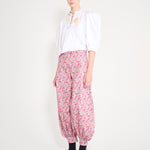 A finely tailored silhouette reminiscent of harem pants with exaggerated balloon legs pleated at the ankle with button clasps. Two side pockets and front pin-tuck details.