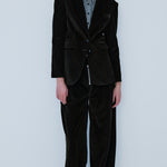 A formed silhouette, the Velvet Morning blazer style jacket with pointed collar features a double button cuff and single breast closure.